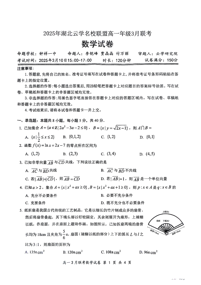 湖北省云学名校联盟2024-2025学年下学期3月高一联考数学