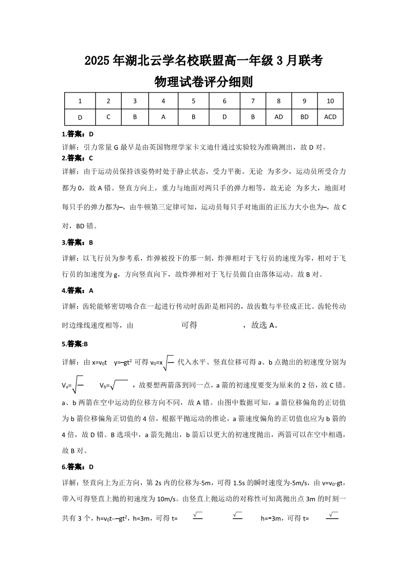 湖北省云学名校联盟2024-2025学年下学期3月高一联考物理答案