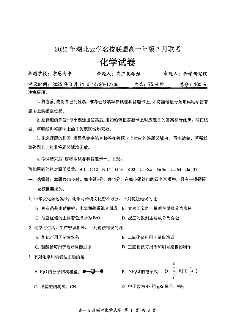 湖北省云学名校联盟2024-2025学年下学期3月高一联考化学