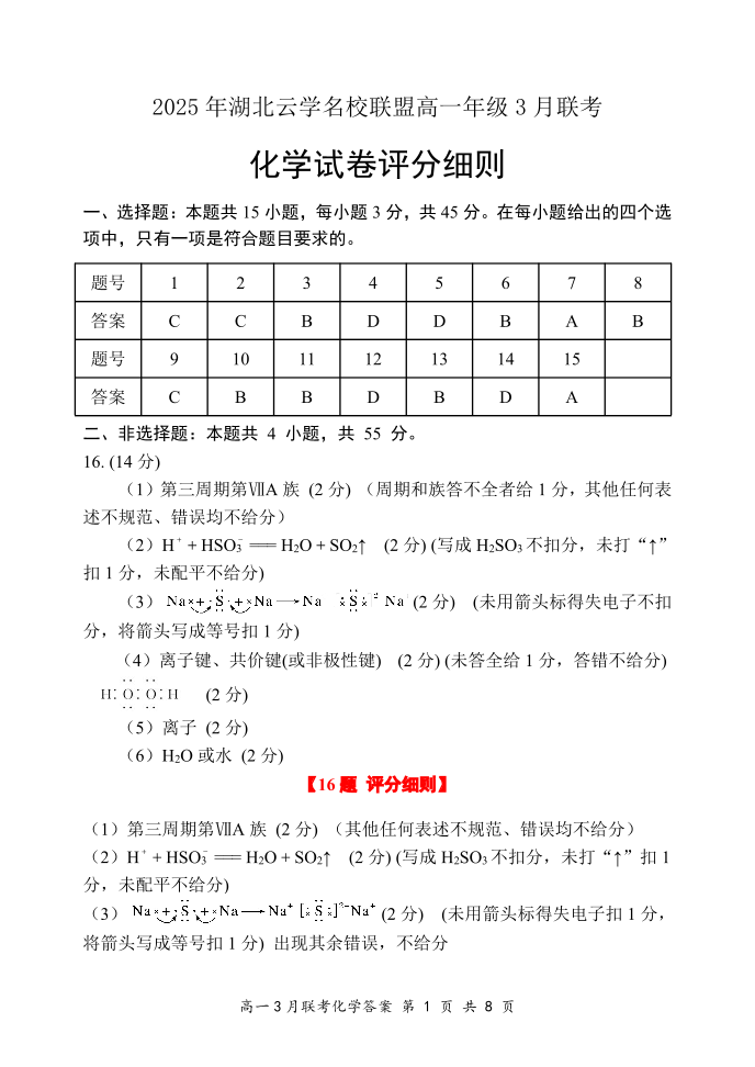 湖北省云学名校联盟2024-2025学年下学期3月高一联考化学答案