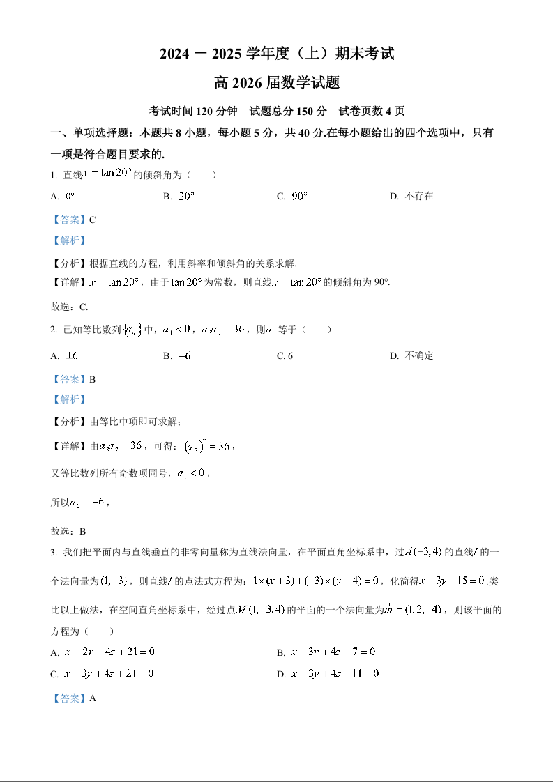 重庆市主城区七校2024-2025学年上学期1月高二期末考试数学(解析版)