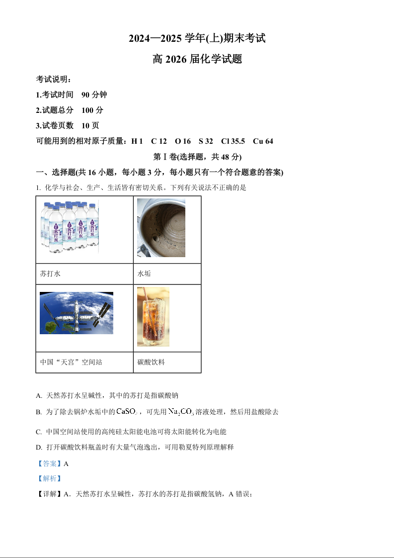 重庆市主城区七校2024-2025学年上学期1月高二期末考试化学(解析版)