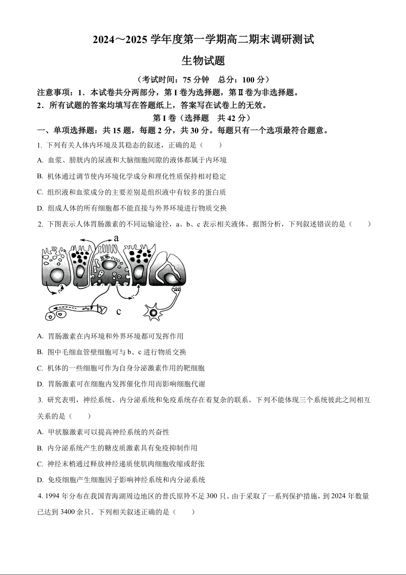 江苏省泰州市2024-2025学年上学期1月高二期末考试生物(原卷版)