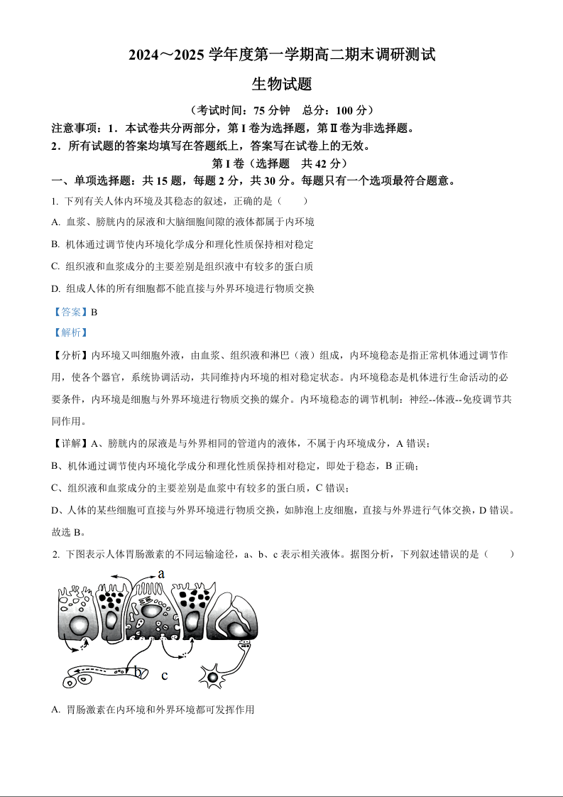 江苏省泰州市2024-2025学年上学期1月高二期末考试生物(解析版)