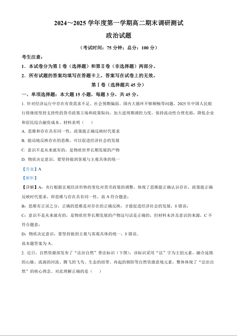 江苏省泰州市2024-2025学年上学期1月高二期末考试政治(解析版)