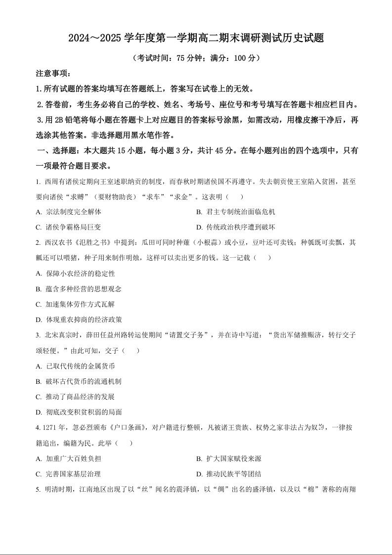 江苏省泰州市2024-2025学年上学期1月高二期末考试历史(原卷版)