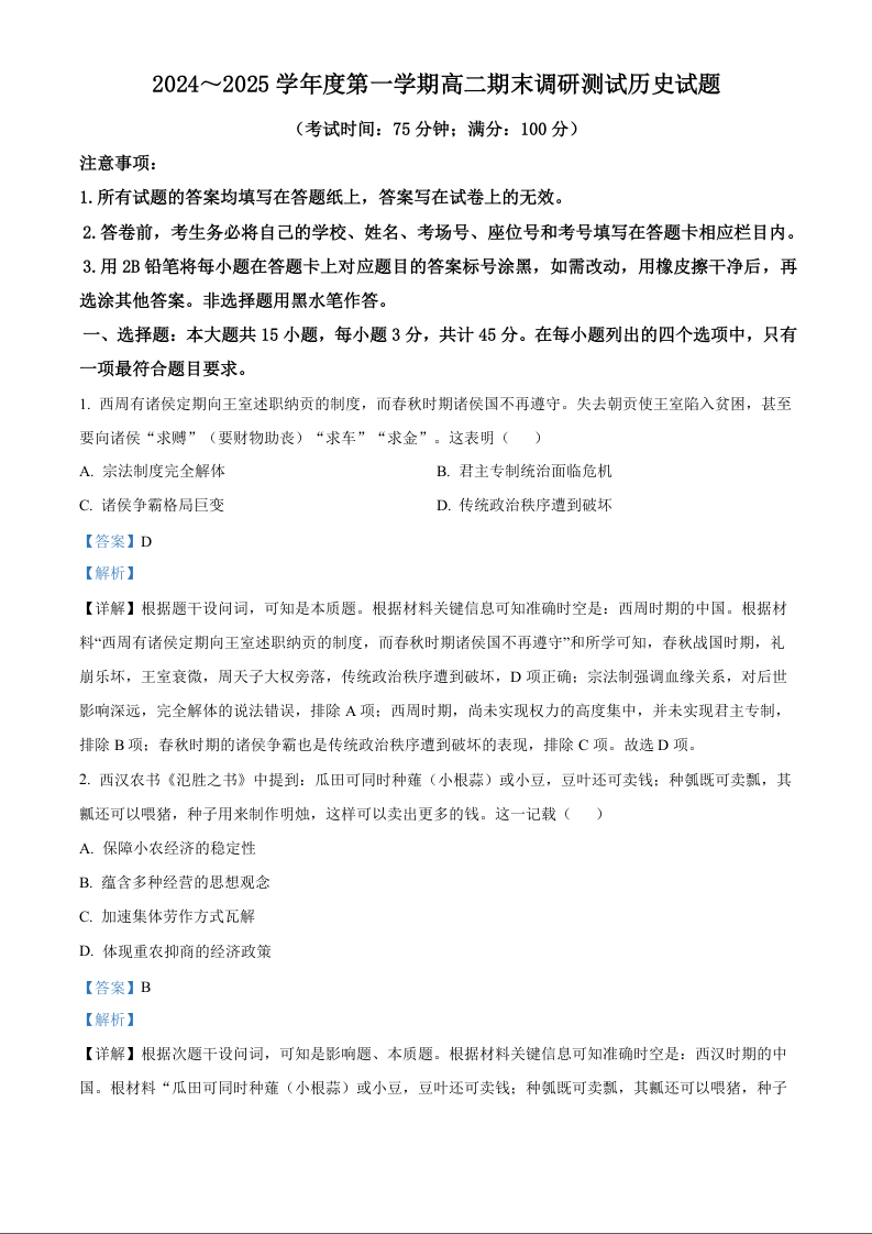 江苏省泰州市2024-2025学年上学期1月高二期末考试历史(解析版)
