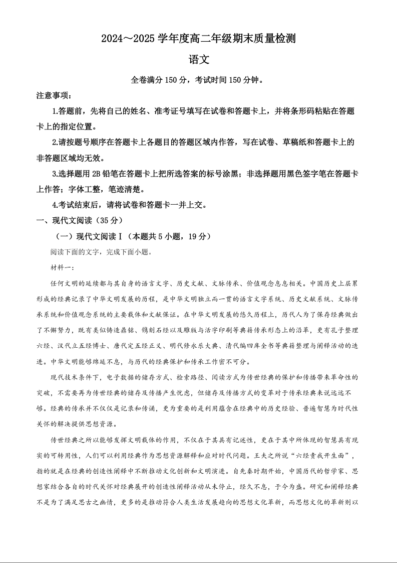 山西省晋城市2024-2025学年上学期1月高二期末考试语文(原卷版)