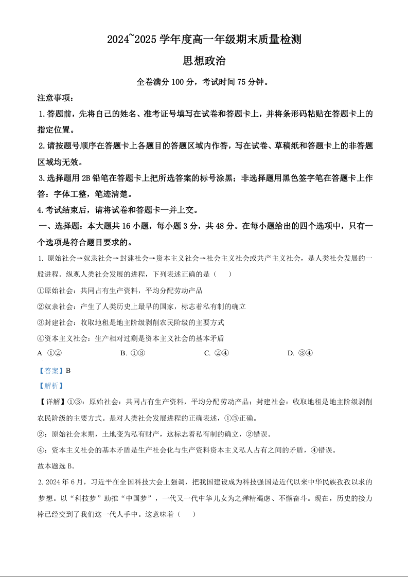 山西省晋城市2024-2025学年上学期1月高二期末考试政治(解析版)