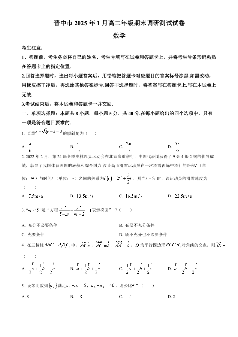 山西省晋中市2024-2025学年上学期1月高二期末考试数学(原卷版)