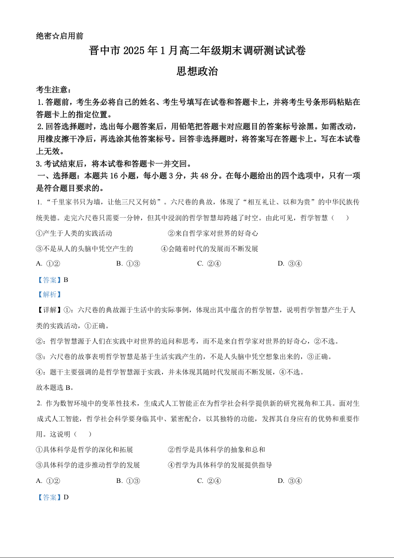 山西省晋中市2024-2025学年上学期1月高二期末考试政治(解析版)