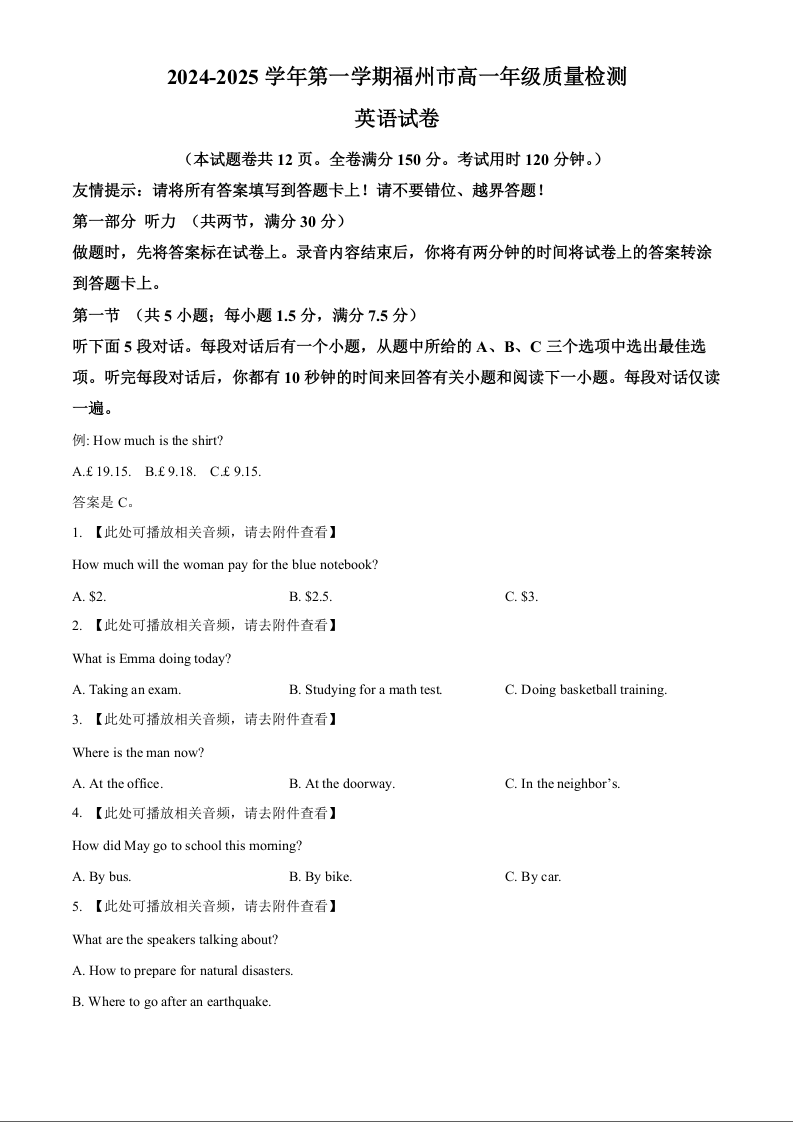 福建省福州市2024-2025学年上学期1月高一期末考试英语(原卷版)