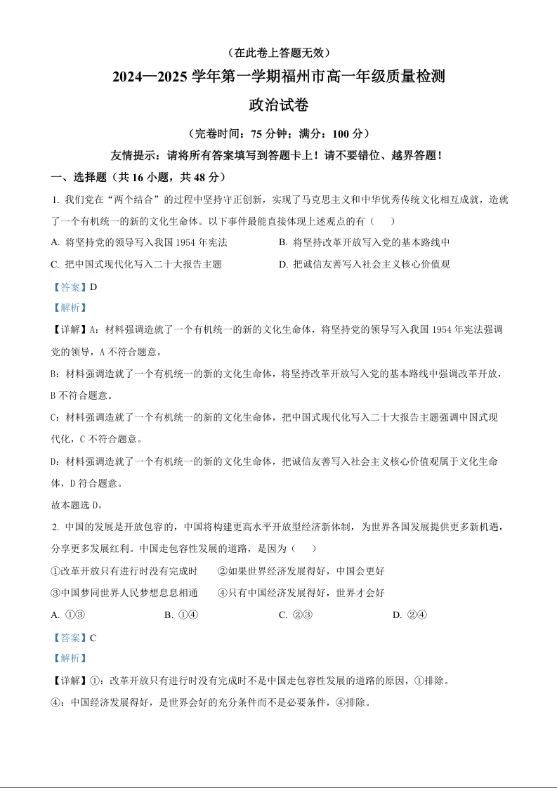 福建省福州市2024-2025学年上学期1月高一期末考试政治(解析版)