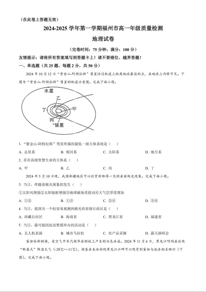 福建省福州市2024-2025学年上学期1月高一期末考试地理(原卷版)