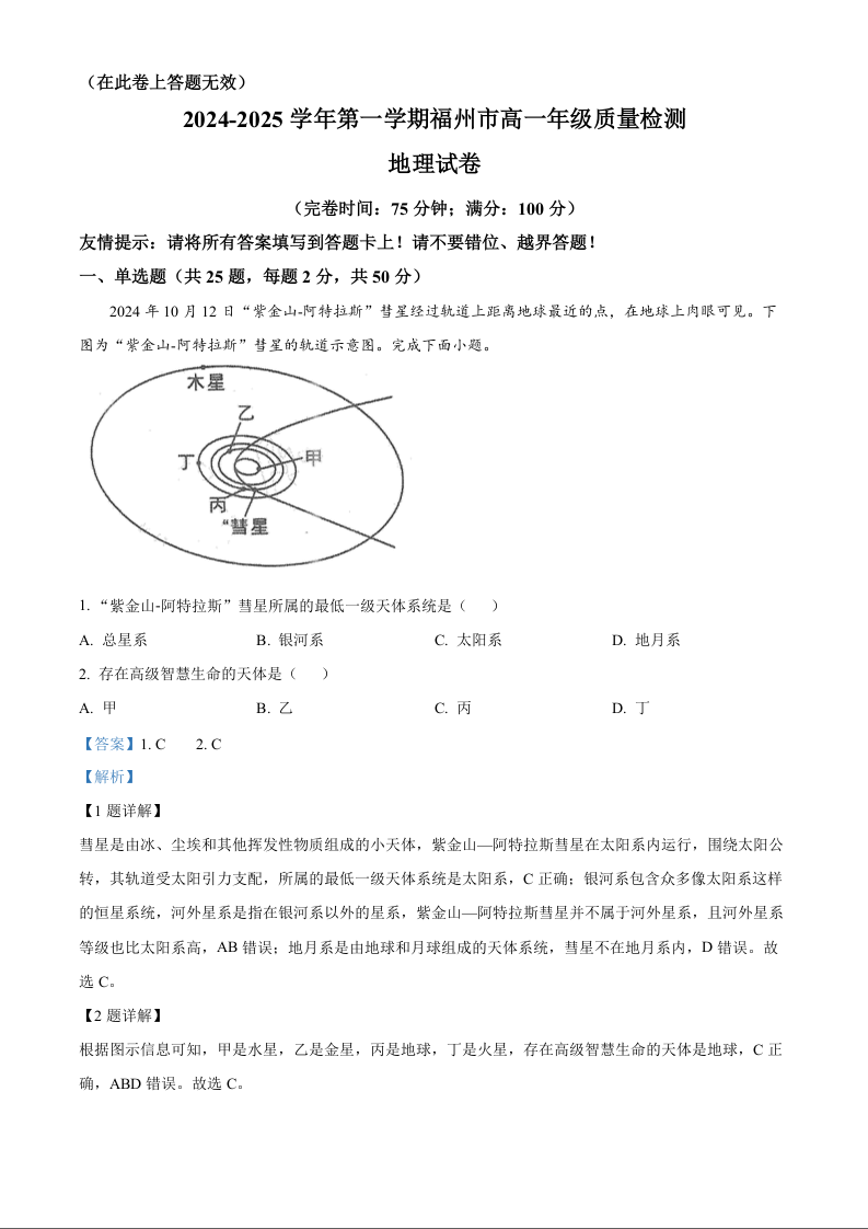 福建省福州市2024-2025学年上学期1月高一期末考试地理(解析版)