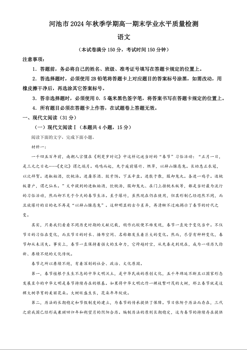 广西壮族自治区河池市2024-2025学年上学期1月高一期末考试语文(原卷版)