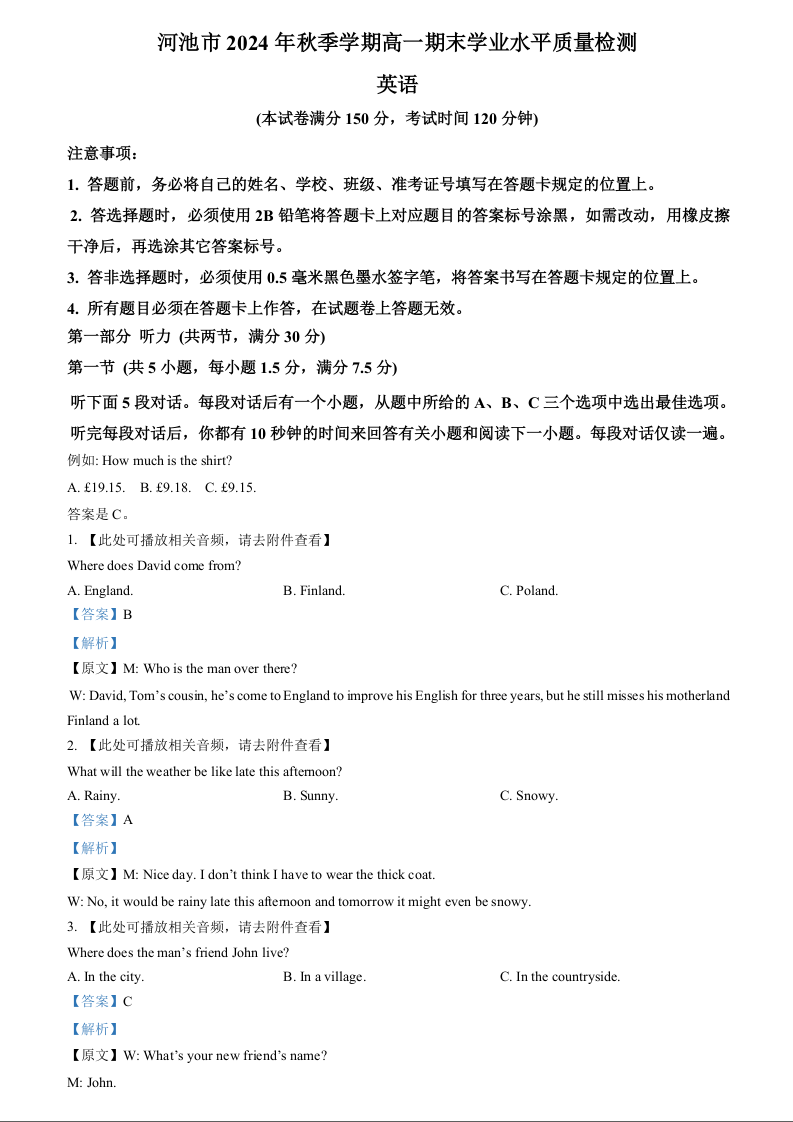 广西壮族自治区河池市2024-2025学年上学期1月高一期末考试英语(解析版)
