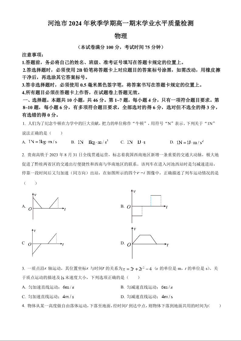 广西壮族自治区河池市2024-2025学年上学期1月高一期末考试物理(原卷版)