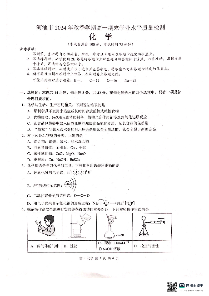 广西壮族自治区河池市2024-2025学年上学期1月高一期末考试化学