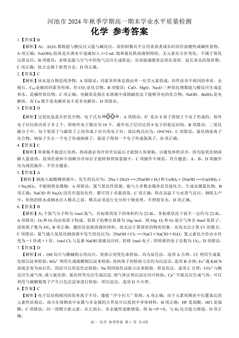 广西壮族自治区河池市2024-2025学年上学期1月高一期末考试化学答案