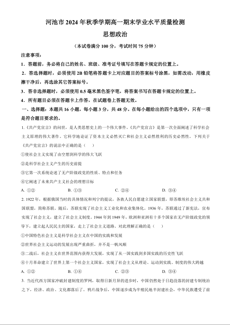 广西壮族自治区河池市2024-2025学年上学期1月高一期末考试政治(原卷版)
