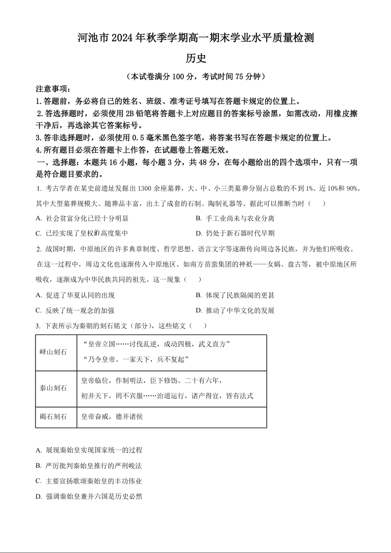 广西壮族自治区河池市2024-2025学年上学期1月高一期末考试历史(原卷版)