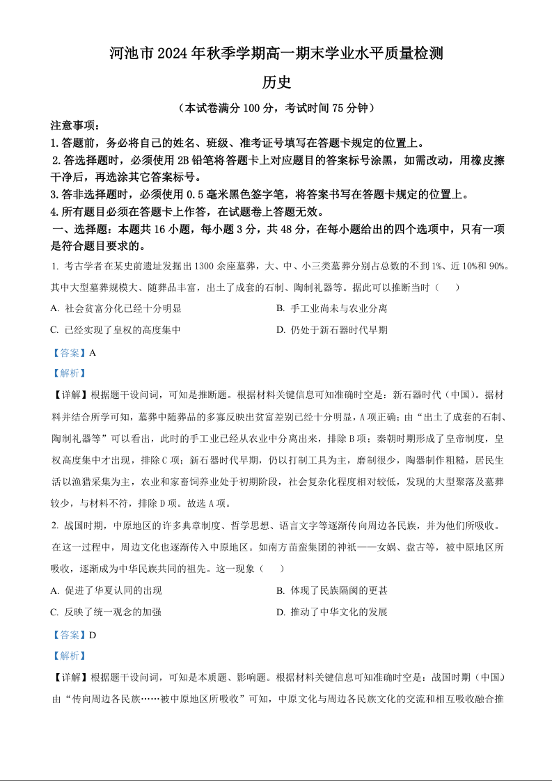 广西壮族自治区河池市2024-2025学年上学期1月高一期末考试历史(解析版)