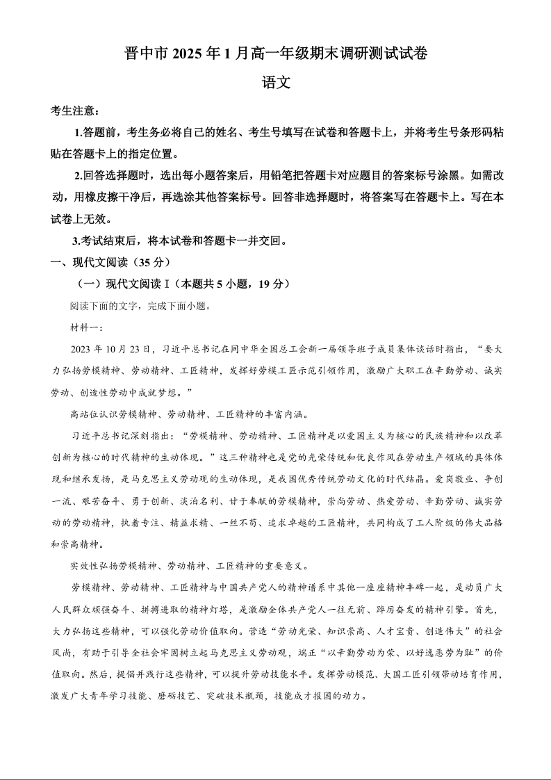 山西省晋中市2024-2025学年上学期1月高一期末考试语文(原卷版)