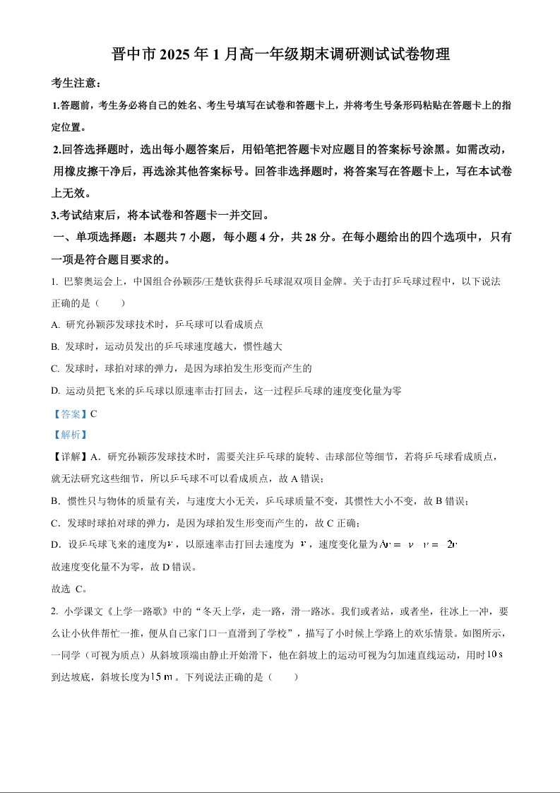 山西省晋中市2024-2025学年上学期1月高一期末考试物理(解析版)