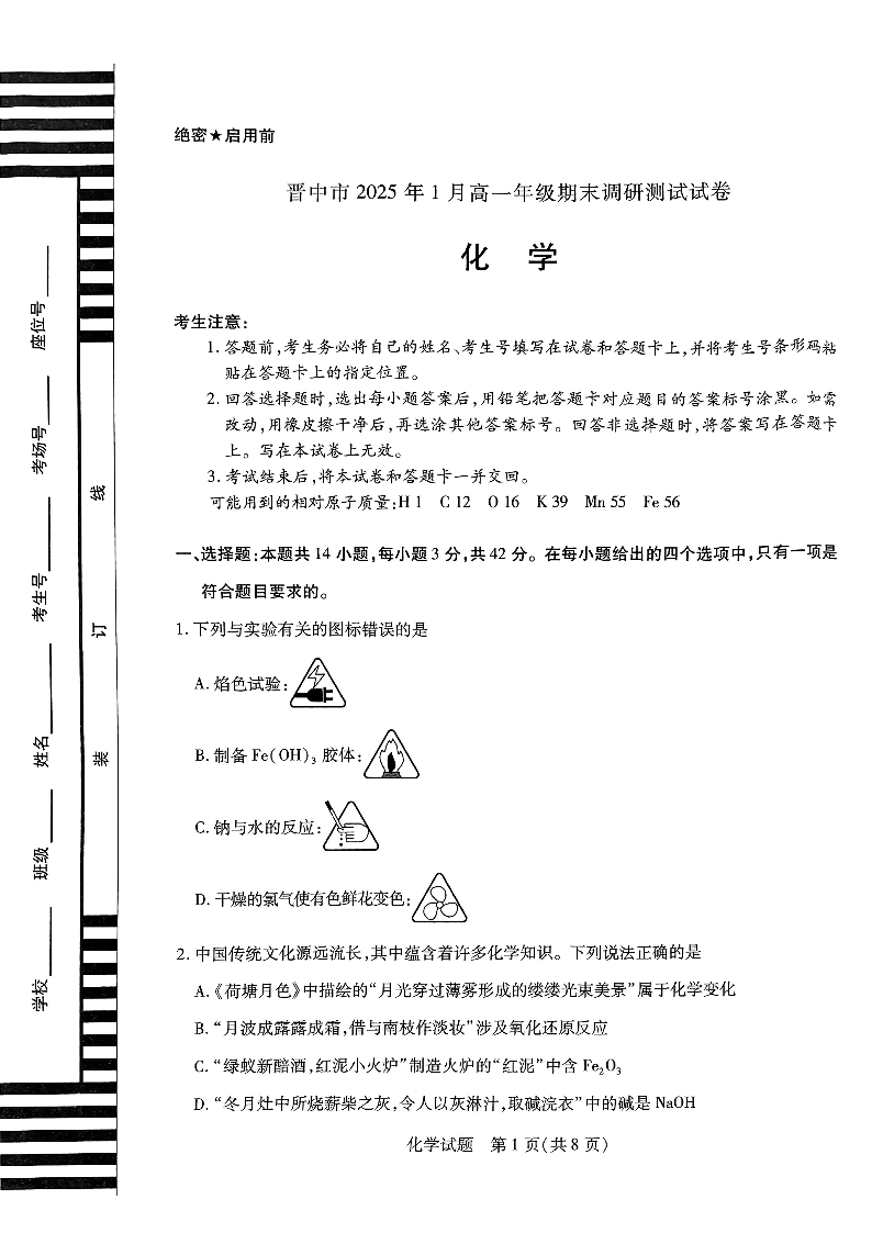 山西省晋中市2024-2025学年上学期1月高一期末考试化学