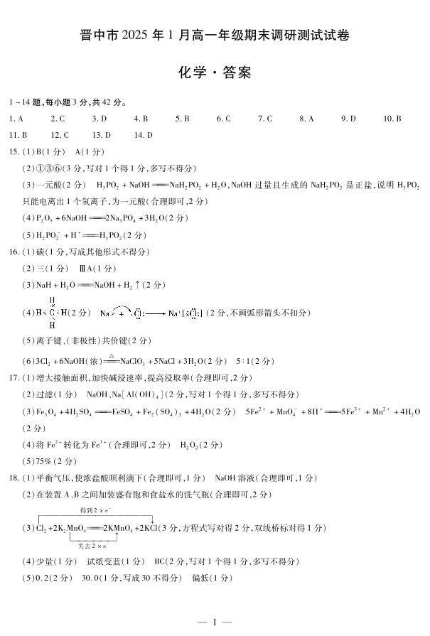 山西省晋中市2024-2025学年上学期1月高一期末考试化学答案