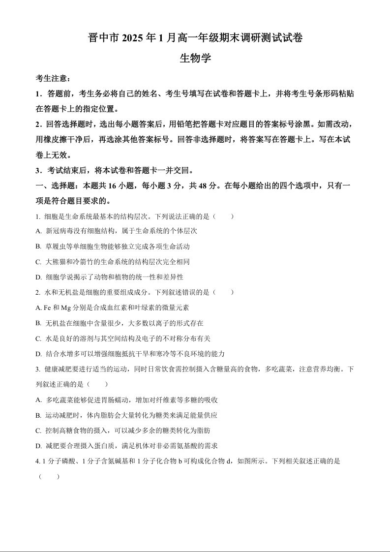 山西省晋中市2024-2025学年上学期1月高一期末考试生物(原卷版)