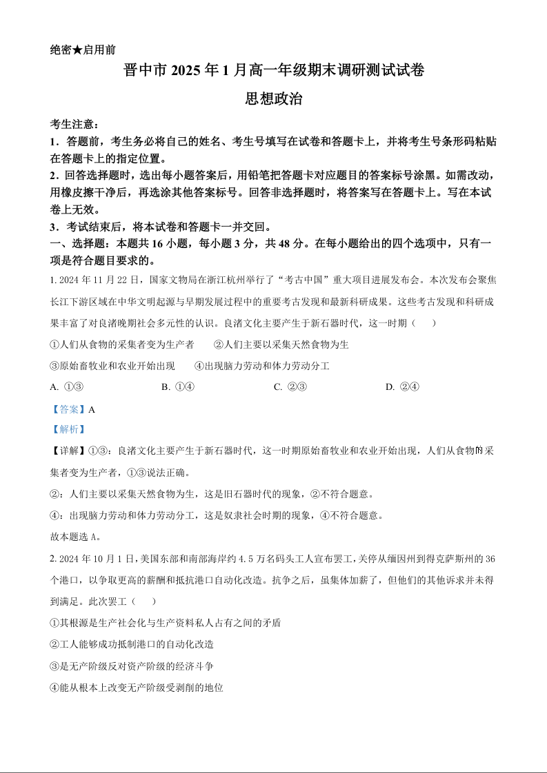 山西省晋中市2024-2025学年上学期1月高一期末考试政治(解析版)