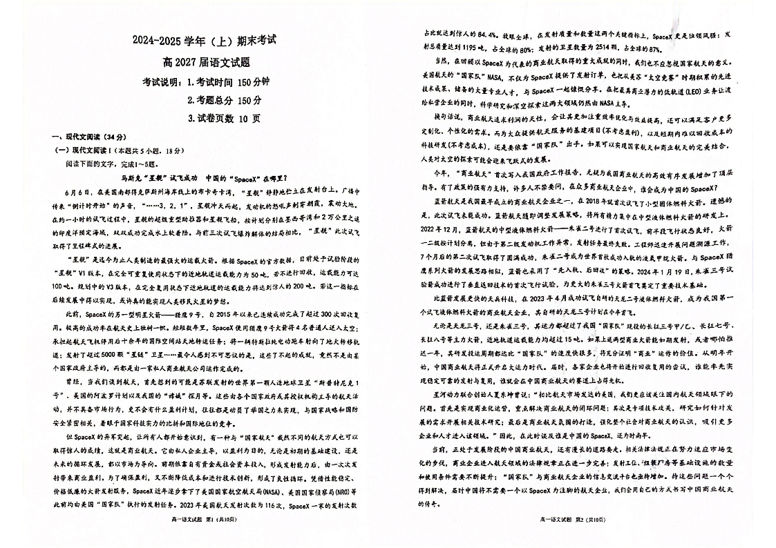 重庆市主城区七校2024-2025学年上学期1月高一期末考试语文