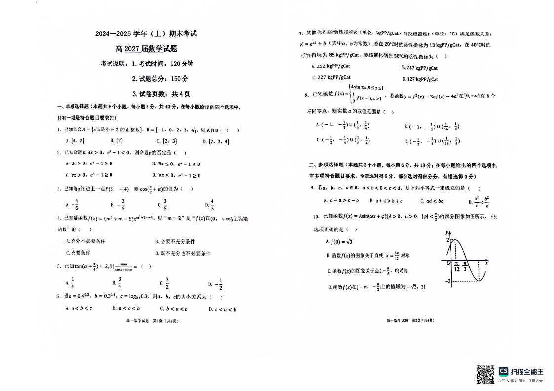 重庆市主城区七校2024-2025学年上学期1月高一期末考试数学