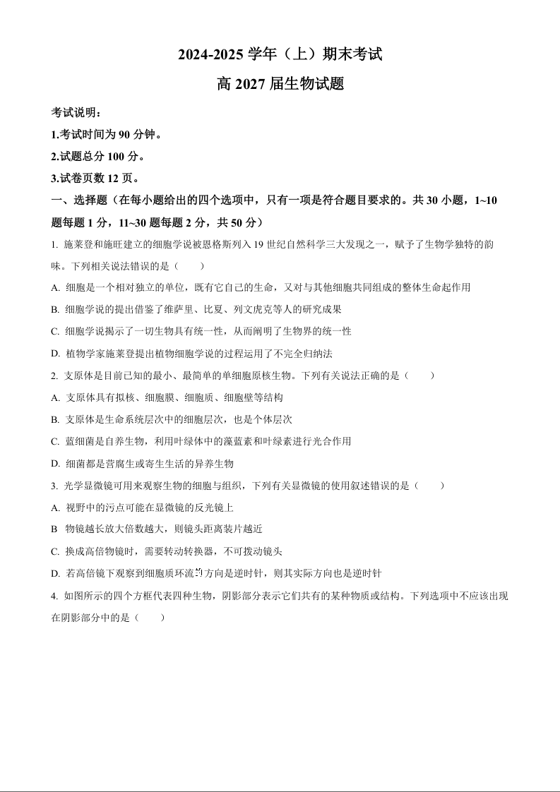 重庆市主城区七校2024-2025学年上学期1月高一期末考试生物(原卷版)