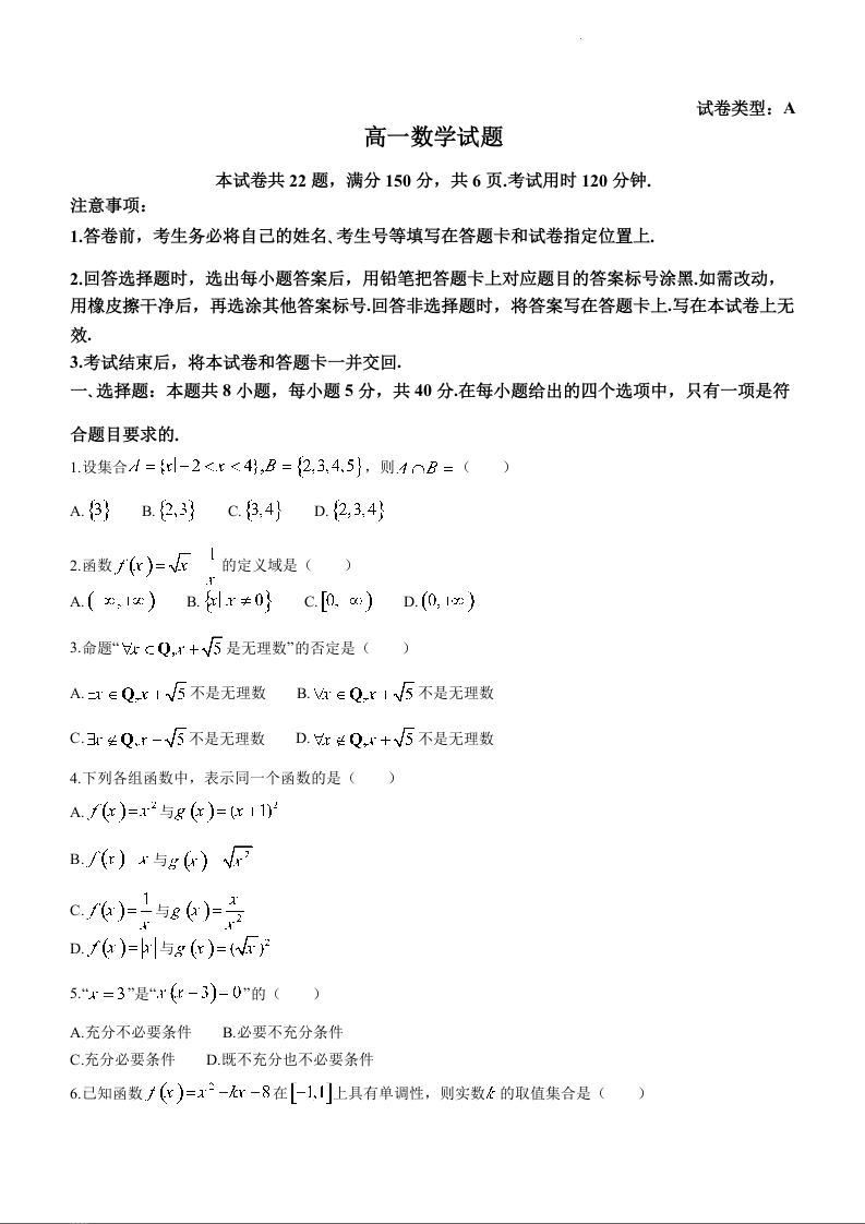 山东省泰安市肥城市2023-2024学年高一上学期期中考试数学+答案