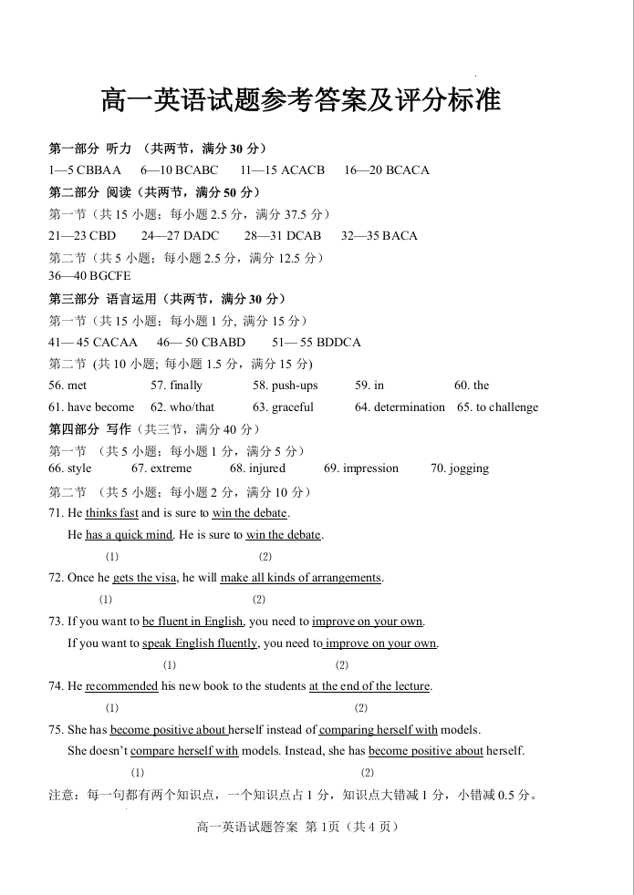 山东省泰安市肥城市2023-2024学年高一上学期期中考试英语答案