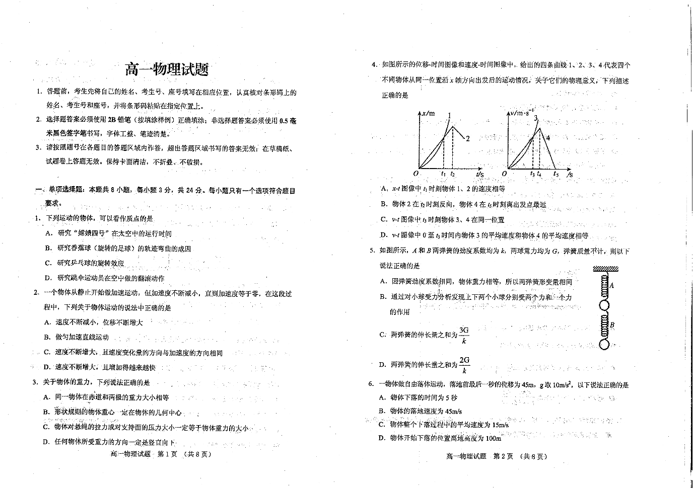 山东省泰安市肥城市2023-2024学年高一上学期期中考试物理