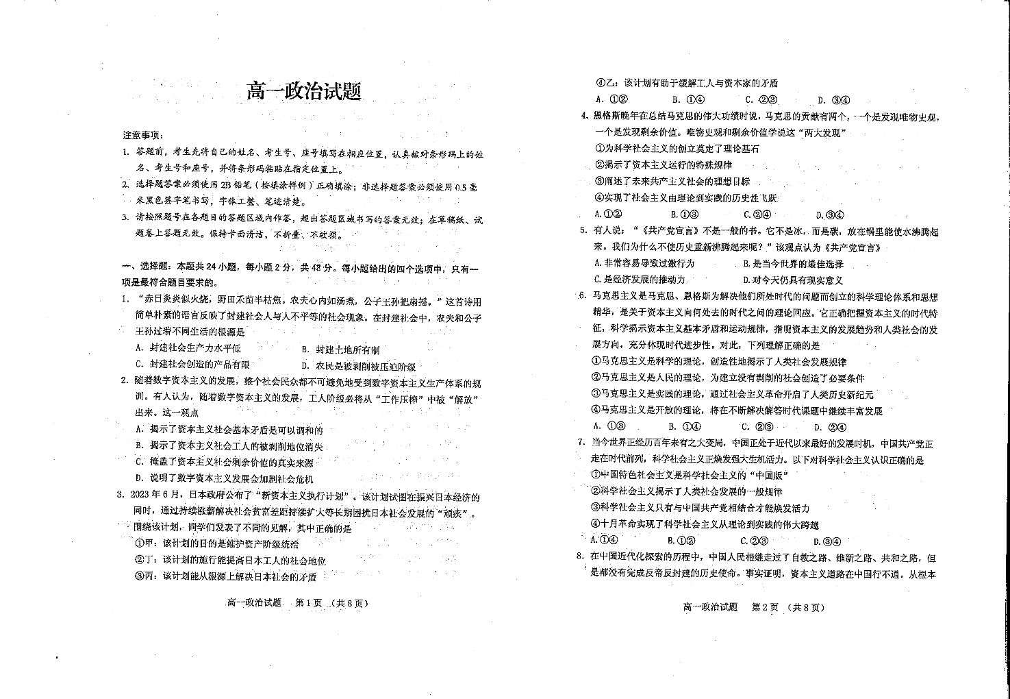 山东省泰安市肥城市2023-2024学年高一上学期期中考试政治