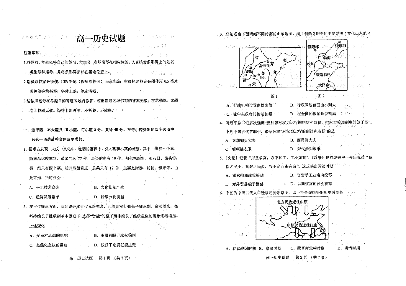 山东省泰安市肥城市2023-2024学年高一上学期期中考试历史