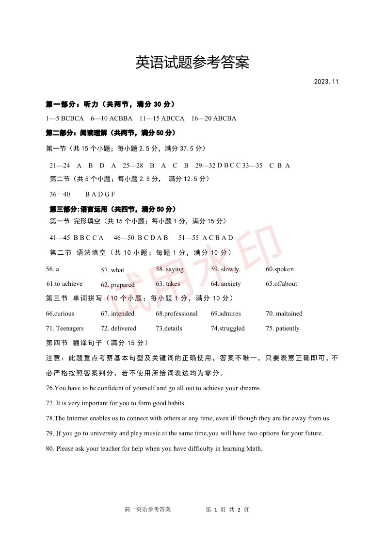 山东省枣庄市滕州市2023-2024学年高一上学期期中考试英语答案