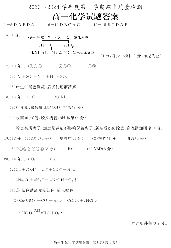 山东省枣庄市滕州市2023-2024学年高一上学期期中考试化学答案