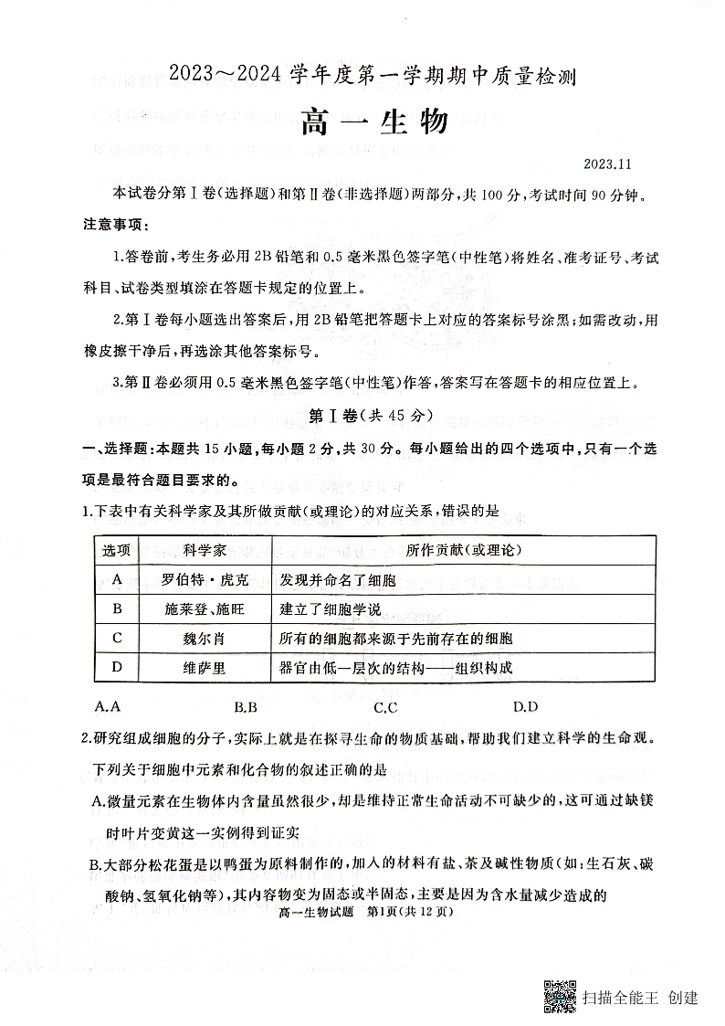 山东省枣庄市滕州市2023-2024学年高一上学期期中考试生物