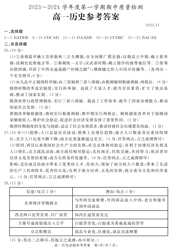 山东省枣庄市滕州市2023-2024学年高一上学期期中考试历史答案