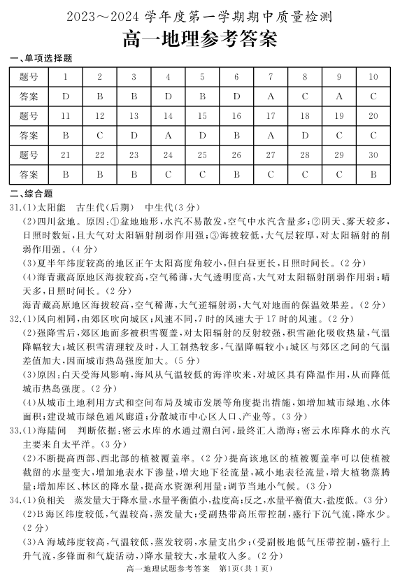 山东省枣庄市滕州市2023-2024学年高一上学期期中考试地理答案