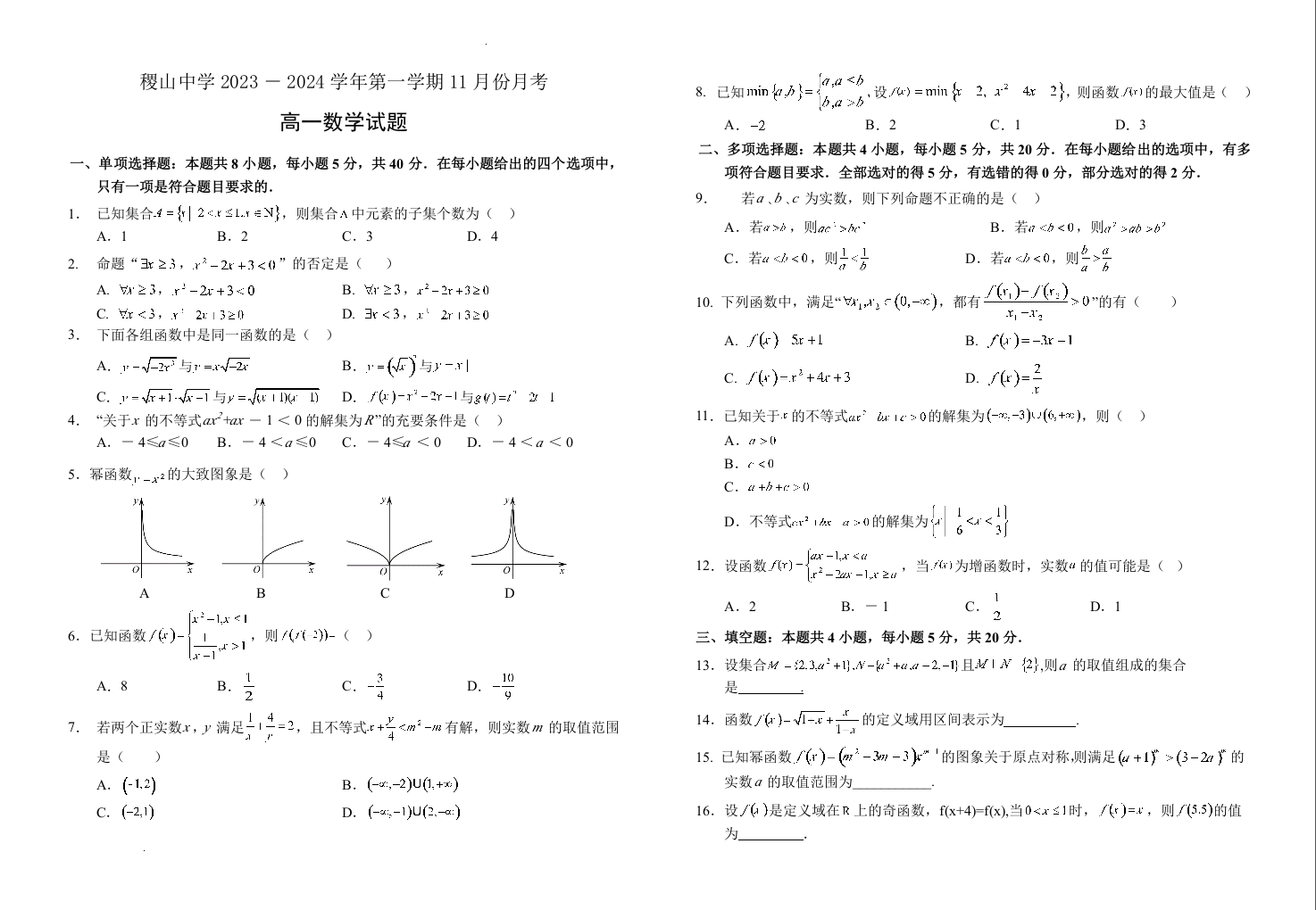 山西省运城市稷山县稷山中学2023-2024学年高一上学期11月月考数学