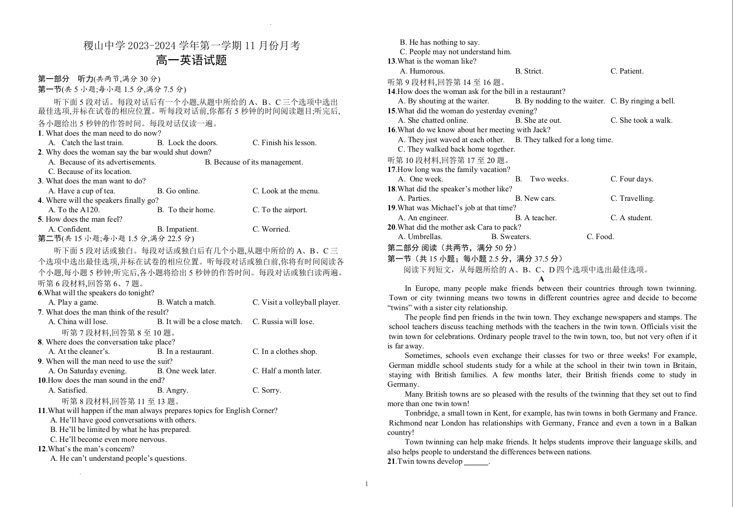 山西省运城市稷山县稷山中学2023-2024学年高一上学期11月月考英语
