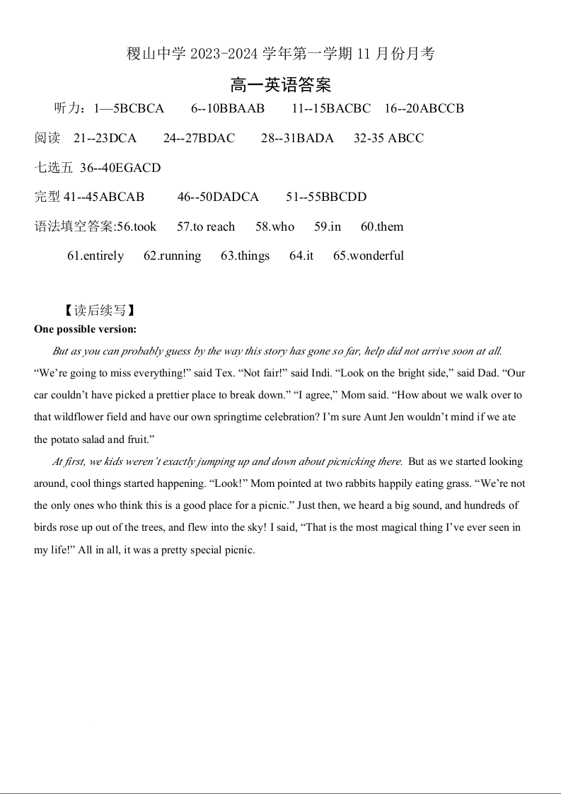 山西省运城市稷山县稷山中学2023-2024学年高一上学期11月月考英语答案