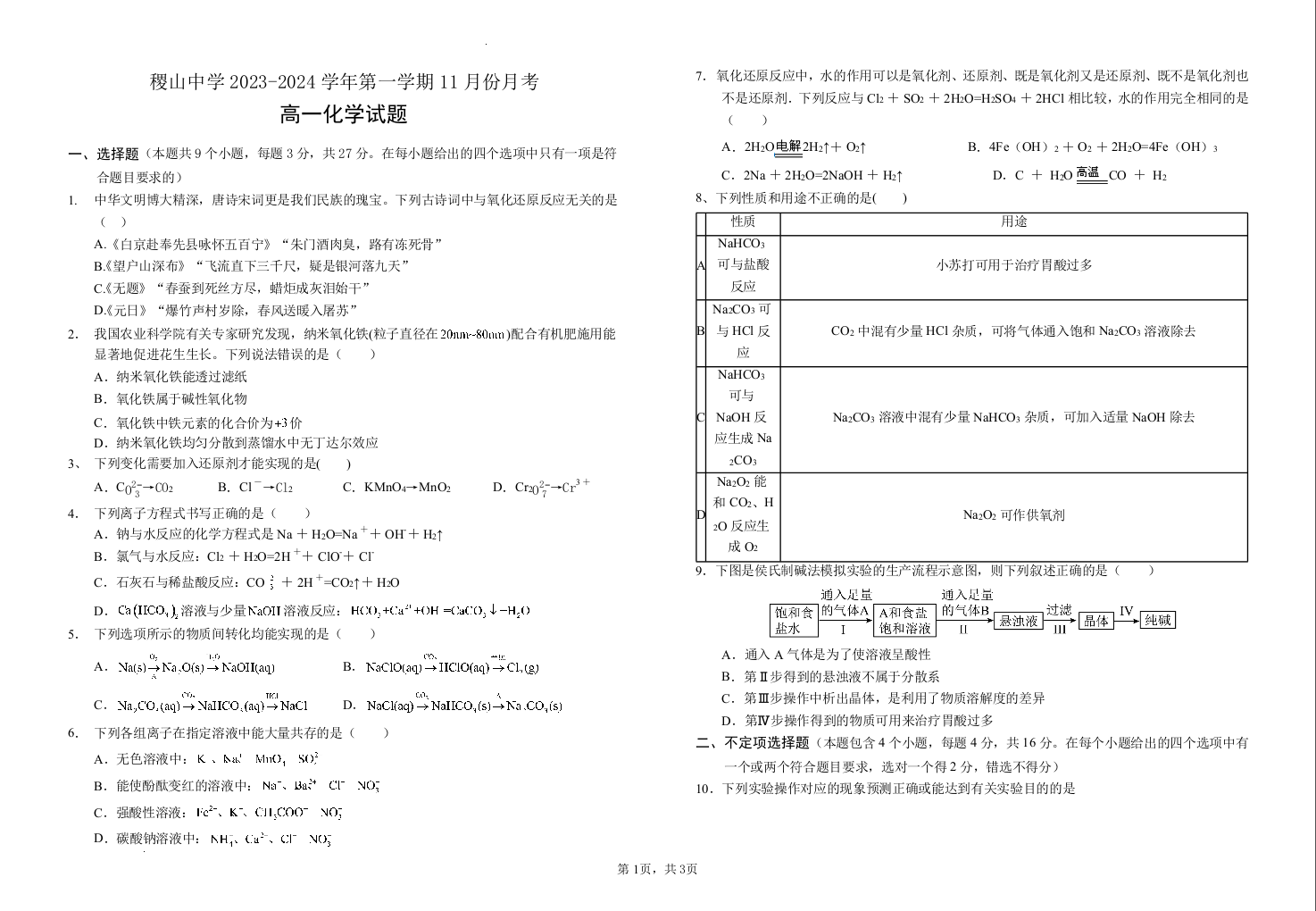 山西省运城市稷山县稷山中学2023-2024学年高一上学期11月月考化学
